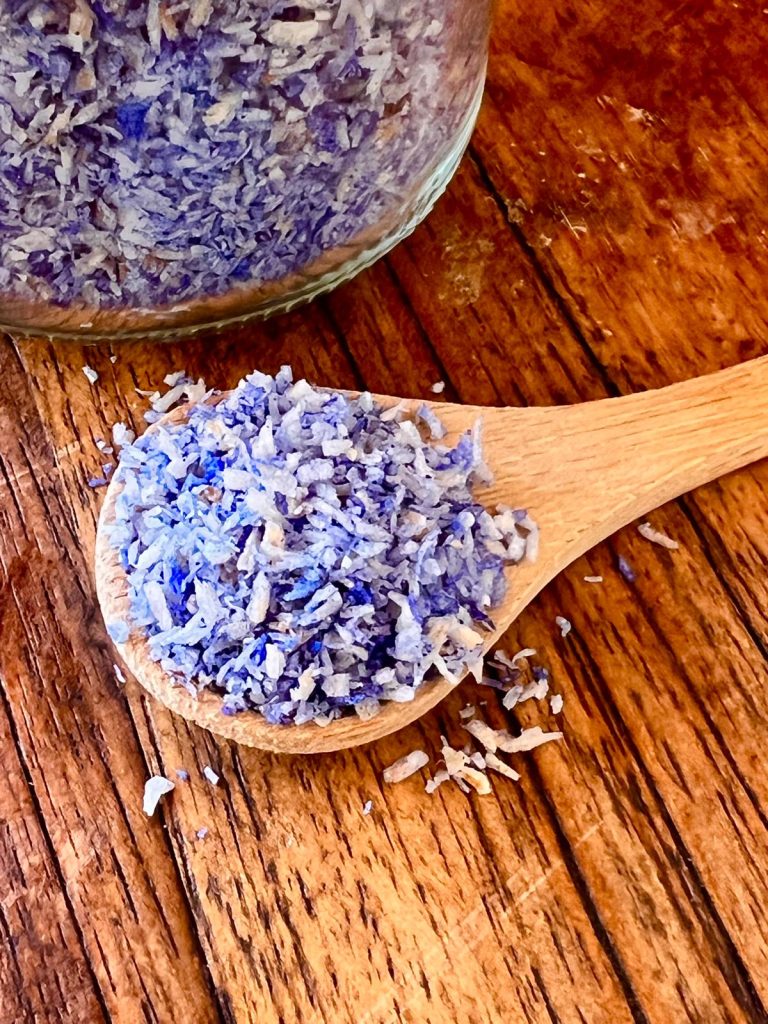 Gemaakt van 95% kokos en een vleugje blauwe spirulina. Dit is het pure, krachtige pigment dat wordt gehaald uit de groene alg Spirulina platensis. Het is dus geen kleurstof, maar een natuurlijk extract vol voedingsstoffen.
