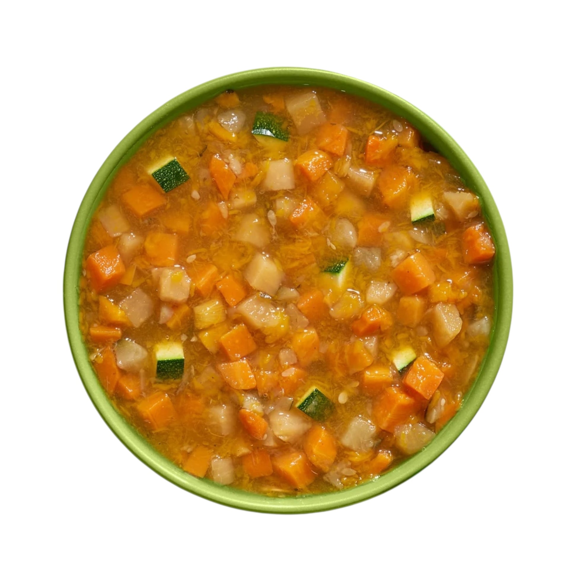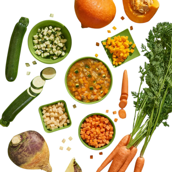 Een fijne combinatie van wortel, pompoen, courgette en koolraap. Mooie blokjes en zachtjes gestoomd, zodat je kunt zien wat je geeft, waardoor het goed verteerbaar is en boordevol natuurlijke voedingsstoffen zit.