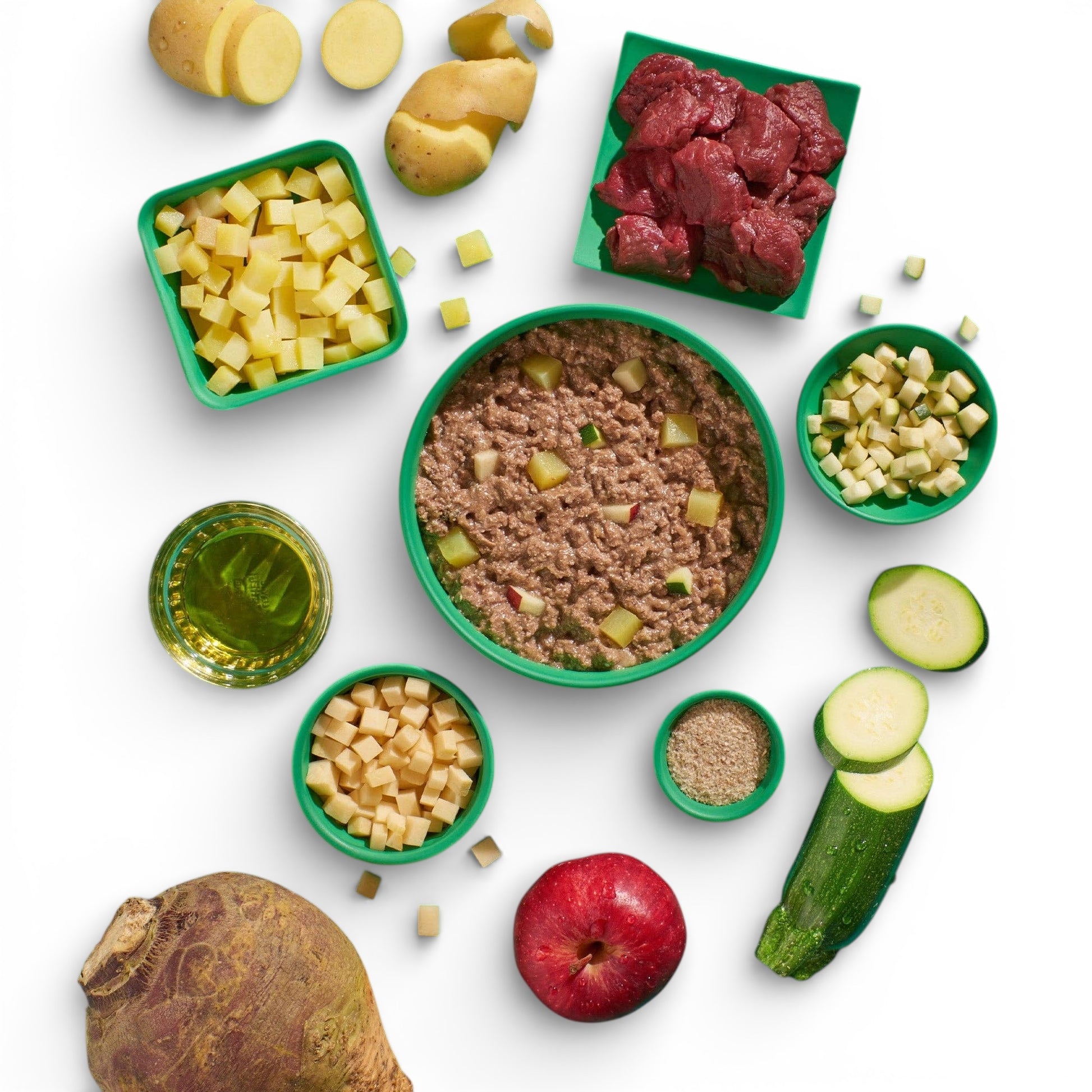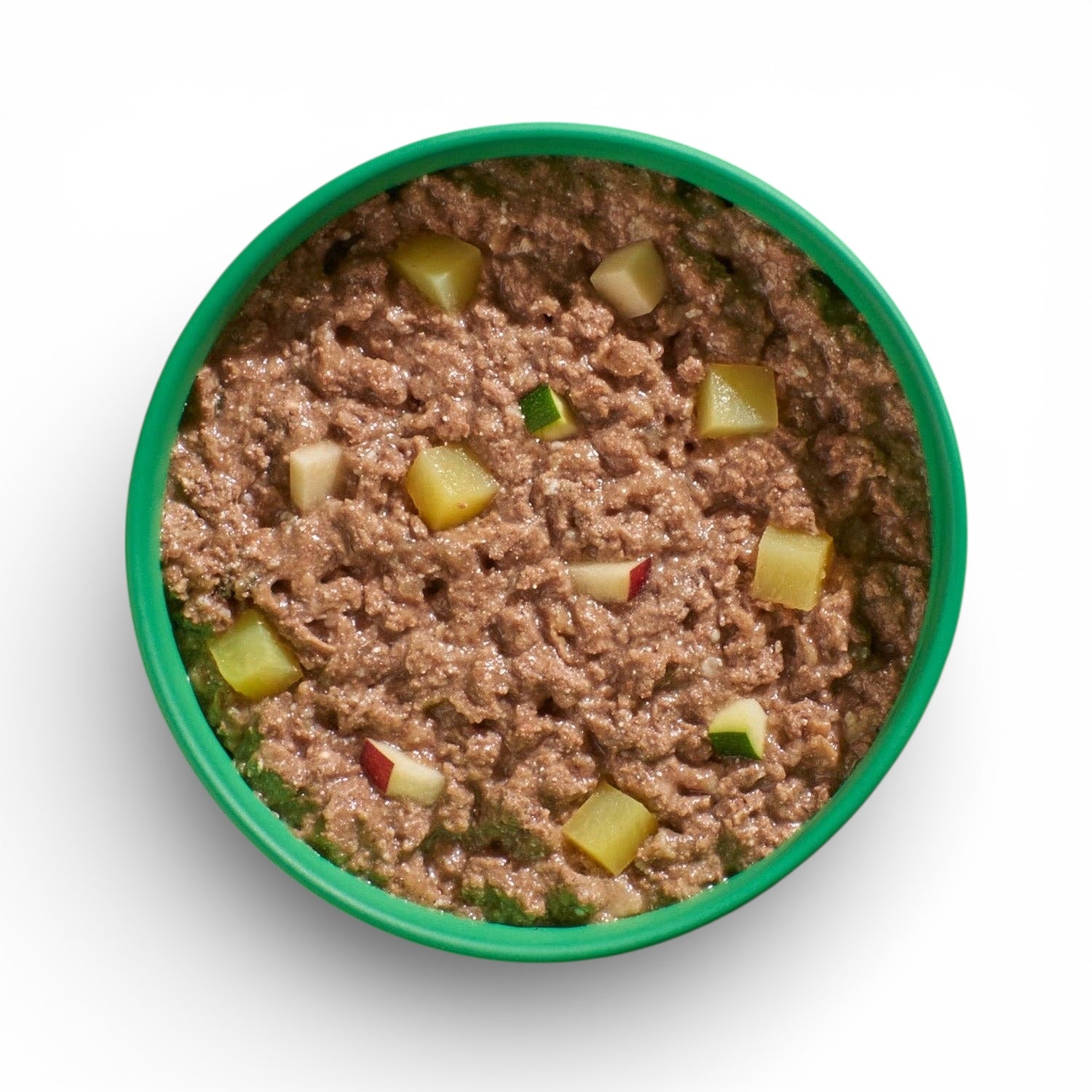 - Ingrediënten: 39% hertenspiervlees, 24% aardappel, 21% water, 5% courgette, 4,9% koolraap, 3% appel, zonnebloemolie, lijnzaadolie, zalmolie, mineralen.