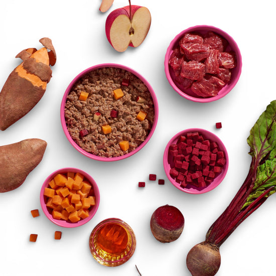 - Ingrediënten: 48% paardenspiervlees, 21% water, 12% zoete aardappel, 10% rode biet, 4% appel, zonnebloemolie, psylliumvezels, lijnzaadolie, mineralen.