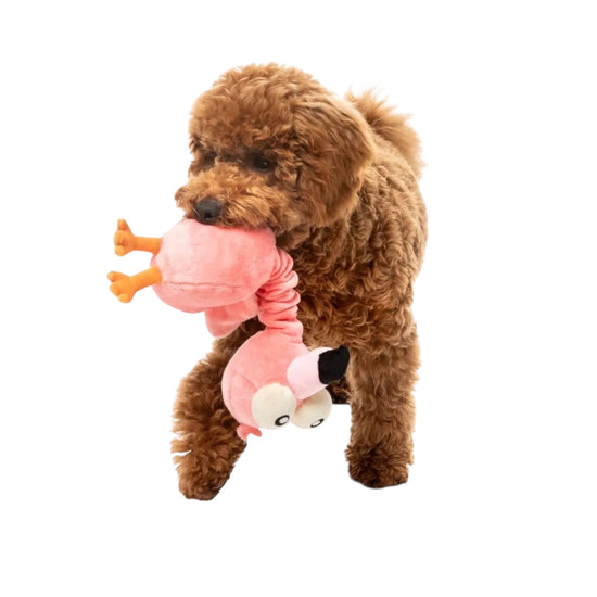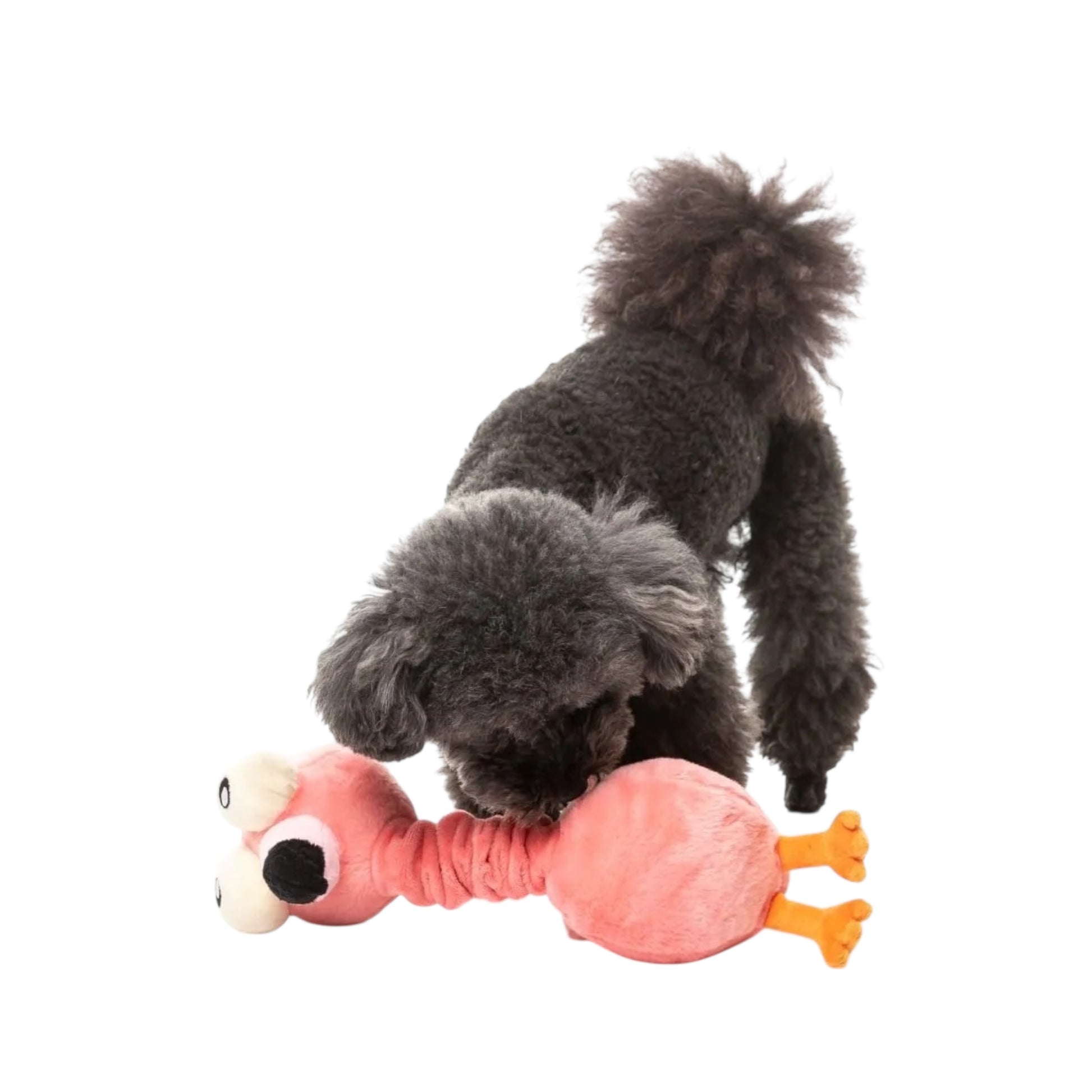 Roze, pluizig en met die iconische stretch-nek, ideaal om vast te grijpen, te schudden en luchtacrobatics uit te voeren. Haar grote ogen zeggen: “Ik ben klaar voor chaos!” …en jouw hond ook.
