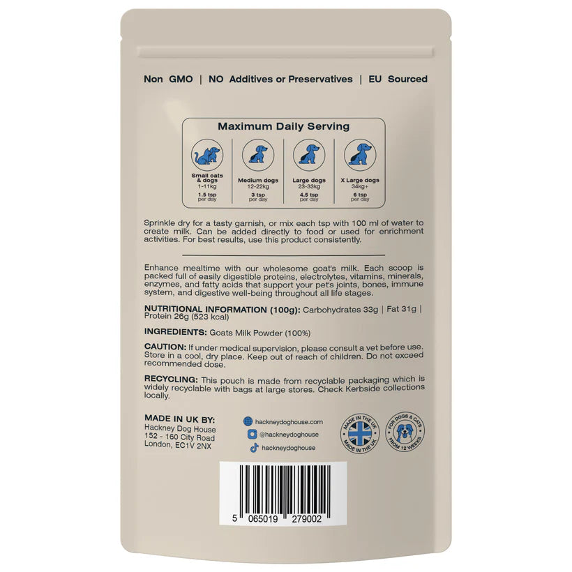 Het geitenmelkpoeder van Hackney Dog House is een hoogwaardige, natuurlijke aanvulling op het dieet van jouw hond. Geitenmelk is makkelijker verteerbaar dan koemelk en bevat kleinere vetdeeltjes. Hierdoor is het perfect voor honden met gevoelige magen of voedselallergieën. Daarnaast is geitenmelk rijk aan vitaminen, mineralen en eiwitten, die bijdragen aan een sterke gezondheid. En is daardoor zeer geschikt voor honden die een extra boost kunnen gebruiken. Bijvoorbeeld in een herstelperiode na ziekte.