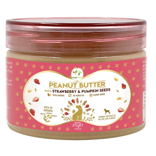 Een potje pure liefde voor je hond! Deze Pawfect Peanut Butter is allesbehalve gewone pindakaas. Gemaakt van 100% natuurlijke pinda’s, met een zomerse twist van aardbei en een crunchy bite van pompoenpitten. Zonder zout, suiker, palmolie of andere nasties – alleen de goede dingen die je hond blij maken.