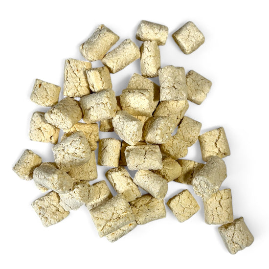 De stukjes zijn zo’n 1–2 cm groot. Perfect om mee te trainen, of om je hond subtiel om te kopen (“kom” werkt ineens verrassend goed). Bovendien geen gekruimel en geen vette handen.