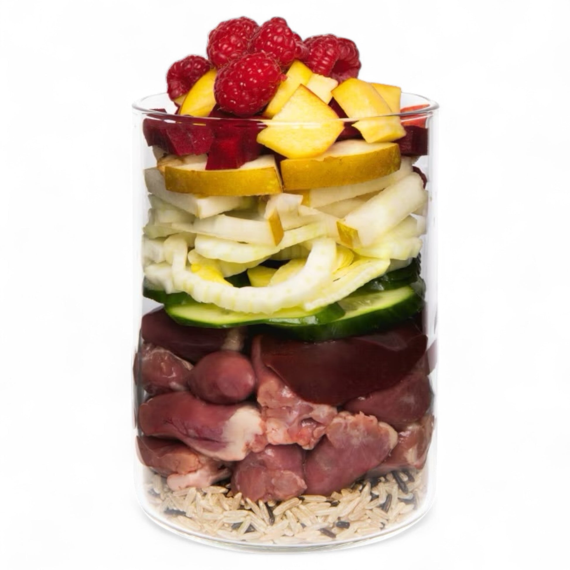 Verhoudingen: Vlees: 53%, bruine rijst 7%, groenten/fruit/kruiden: 37%, overige ingrediënten: 3%.