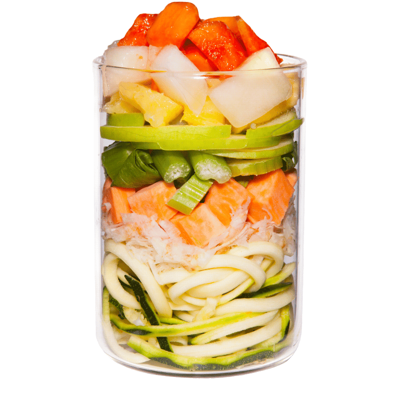 Ingrediënten: pompoen (22.5 %), courgette (22.5 %), pastinaak* (9 %), selderij (9 %), zoete aardappel (9 %), ananas (7 %), peer (7 %), gele meloen (6 %), papaja (6 %), biergist*, kamille* (0.3 %), peterselie* (0.3 %), waterkers* (0.2 %), tijm* (0.2 %), kervel* (0.2 %), kleimineraal*, zeewier* *gedroogd