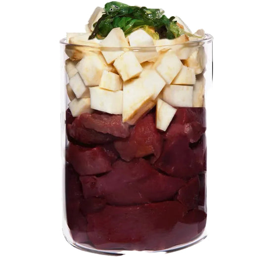 Eend is licht verteerbaar en wordt vaak goed verdragen bij intoleranties. Een beetje lijnzaad ondersteunt de spijsvertering en huid, zeewier levert natuurlijke mineralen. Ideaal bij eliminatiedieet.