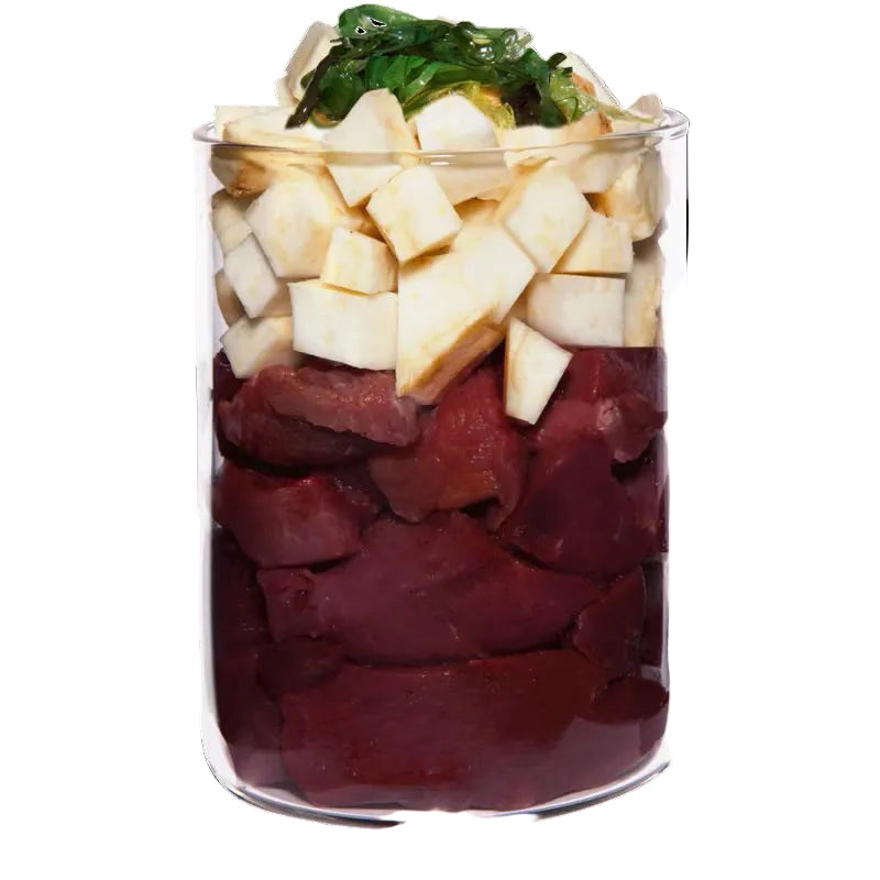- Verhouding vlees: 60%, groenten/fruit/kruiden: 36%, overige ingrediënten: 4%.