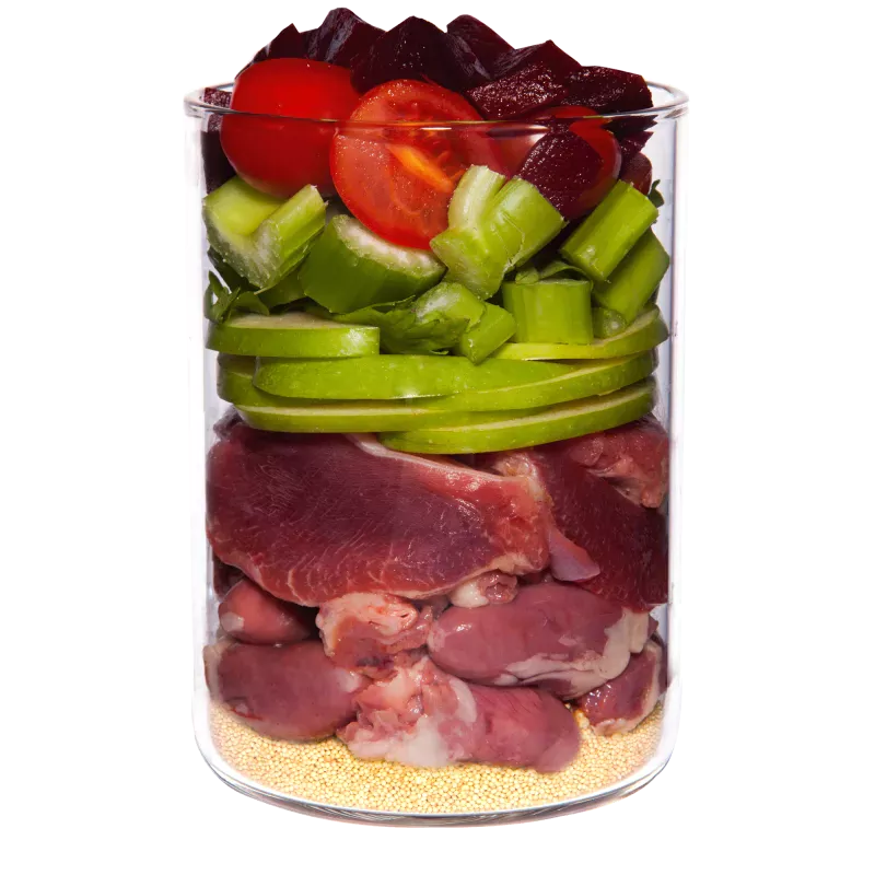 Verhouding: vlees55%, groenten/fruit/kruiden 33%, amarant 5%+ gierst 5%, andere ingrediënten 2%.