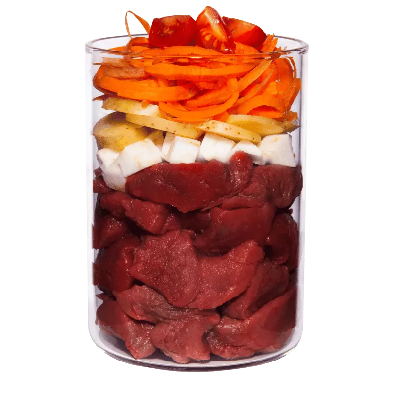 Verhoudingen: Vlees: 60%, aardappel 8%, groenten/fruit/kruiden: 26%, overige ingrediënten: 6%.