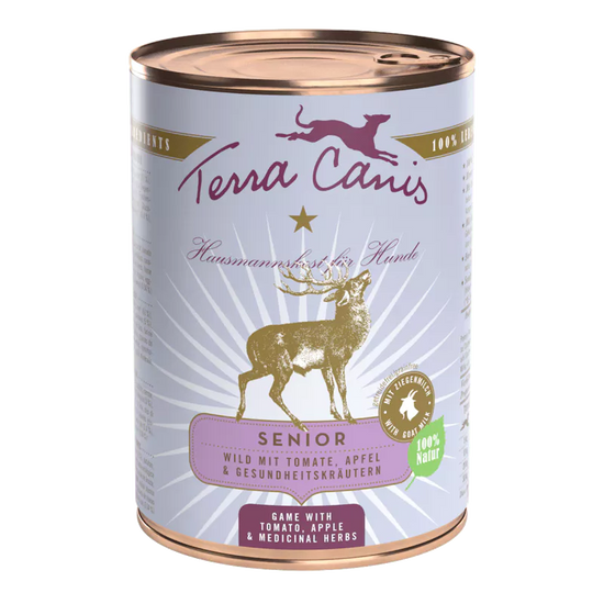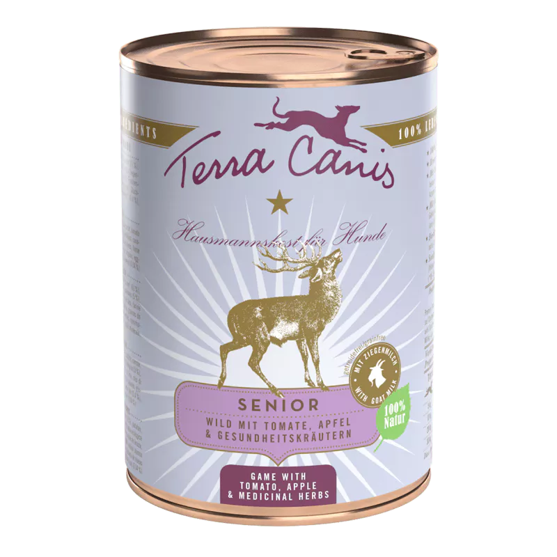 Dit Terra Canis SENIOR menu is speciaal ontwikkeld voor oudere honden en bevatten zo’n 60% vlees van wild en hert. Het hoge eiwitgehalte helpt spierverlies tegen te gaan en ondersteunt de vitaliteit. Omdat de spijsvertering met de jaren wat trager wordt, zijn de menu’s volledig graanvrij en aangevuld met vezelrijke groenten en fruit.