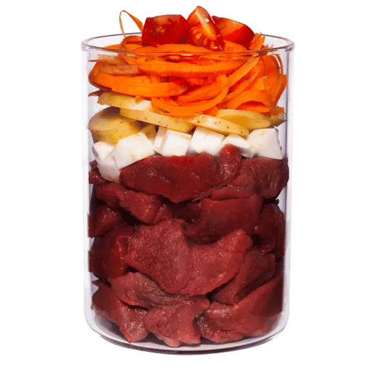 - Stevige stukjes orgaanvlees en zachte blokjes groenten in smaakvolle jus
