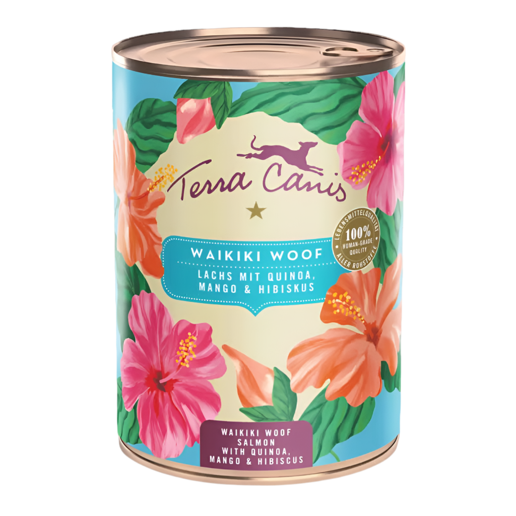 Hondenvoer met hibiscus? Ja! Terra Canis maakt het. Het Waikiki Woof menu is geïnspireerd op de Hawaïaanse keuken. Een fantastische combinatie van 53% fijne zalm, verse groenten (o.a. wortel, komkommer), quinoa en heerlijk fruit ( o.a. mango, ananas). En als heel speciale afronding zorgt een echte hibiscusbloem, de Hawaïaanse nationale bloem. Dit bijzondere menu ruikt naar zalm met subtiele fruit en bloemtonen en het smaakt zoals onze 'mensen' zalm smaakt, maar dan wat fruitiger en zonder zout.... Echt waar.