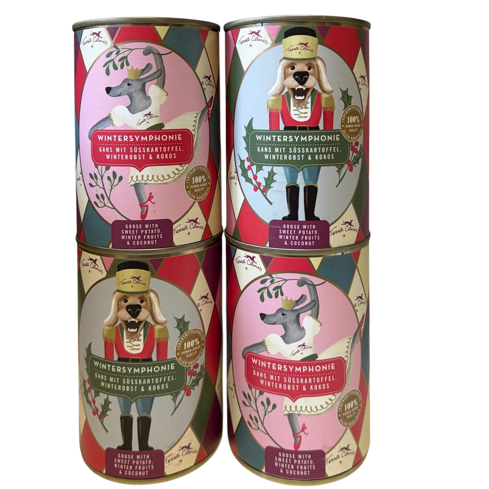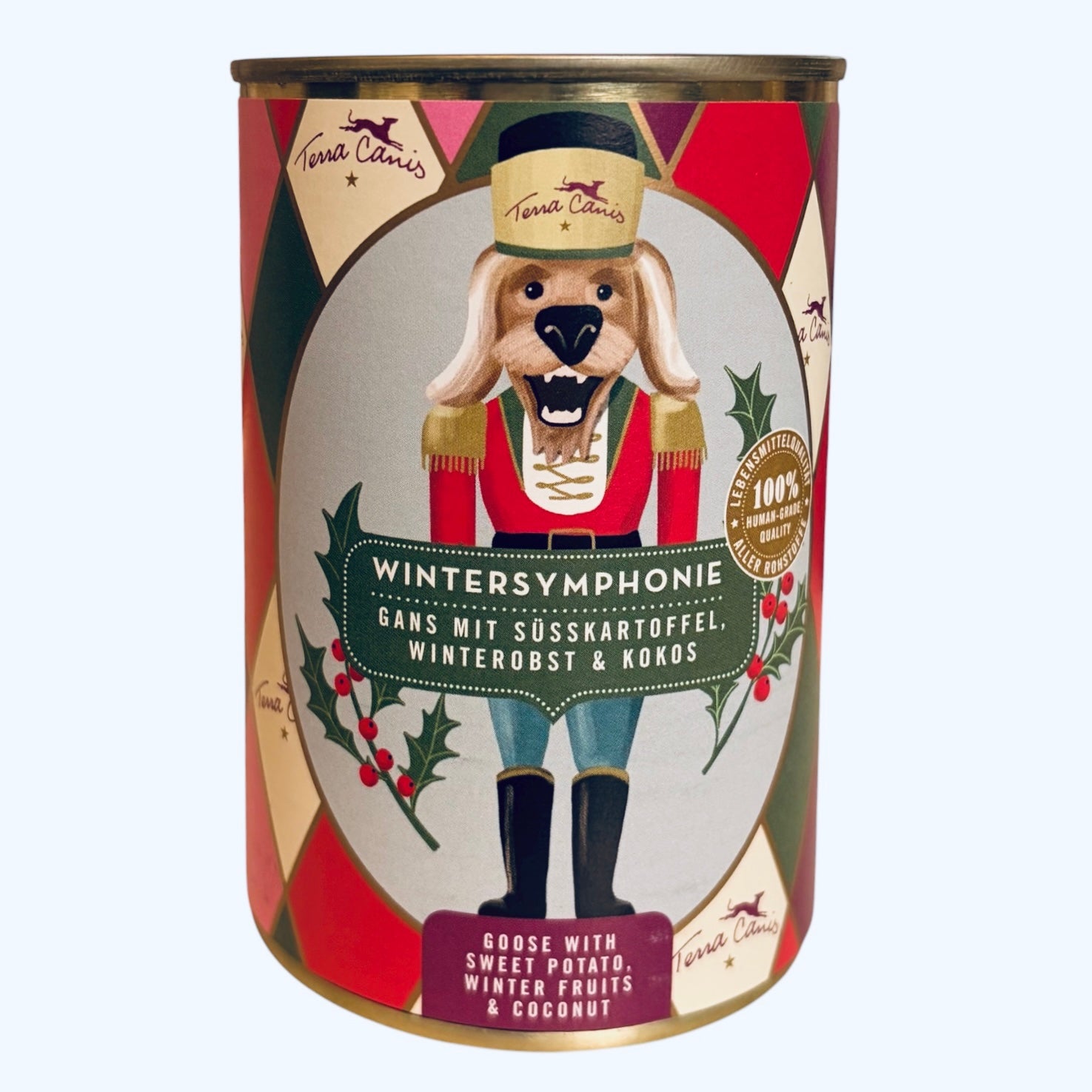 hij krijgt een Wintersymphonie. Terra Canis heeft zichzelf overtroffen en heeft een feestelijke mix gemaakt met heerlijk ganzenvlees, zoete aardappel, winterfruit en een tikkeltje kokos voor extra glamour. Dat verdient toch elke trouwe viervoeter die altijd klaarstaat voor knuffels en sneeuwpret?