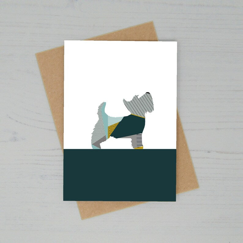 Gemaakt door Lucy Alice Designs. Dubbele matte kaart met een blanco binnenkant en voorzien van een gerecycleerde Kraft envelop. Als de ontvanger van bijzondere ontwerpen én van Westies houdt dan is dit de kaart om te koesteren. Ook mooi om in te lijsten.