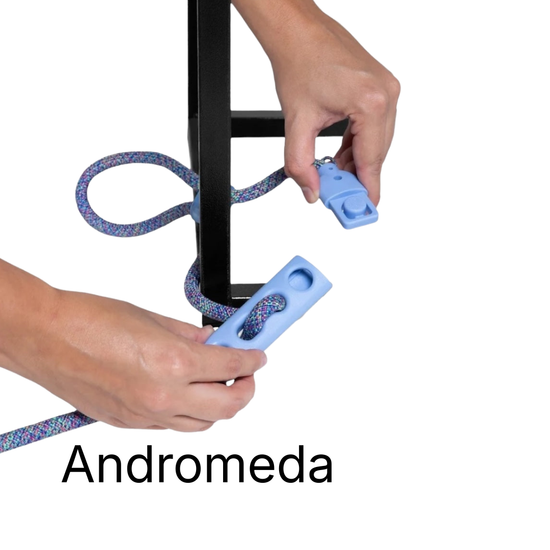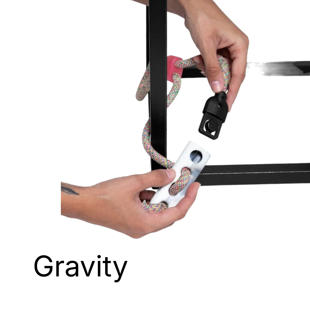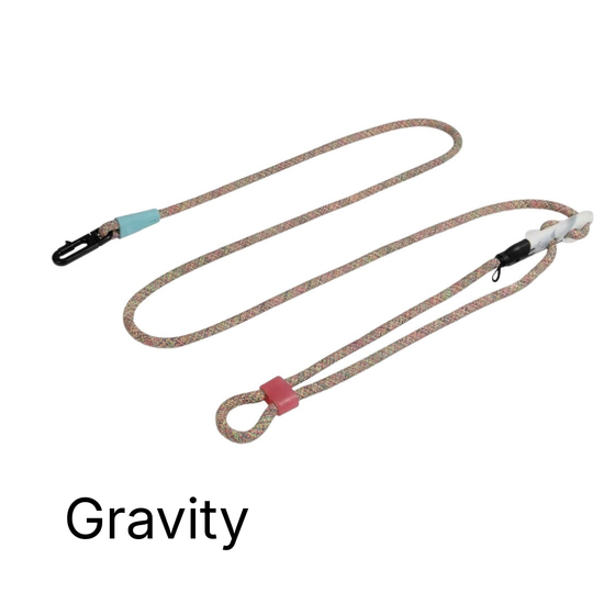 - Gravity: Licht beige lijn met fellere, ingeweven gekleurde draden en een zwart-wit gemêleerde verstelclip. Zwarte musketon met lichtblauwe afwerking en een transparant roze handvatschruiver. Licht, speels en modern.