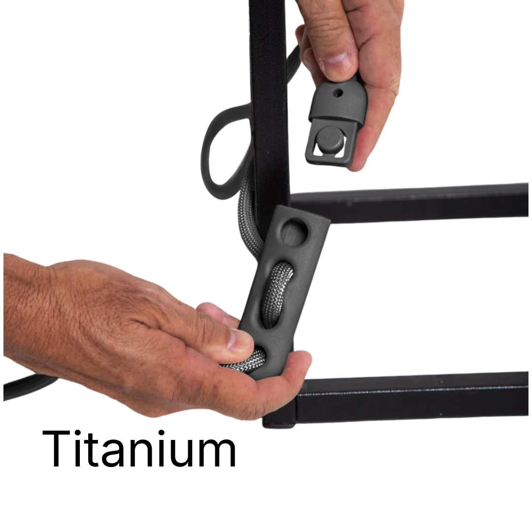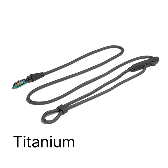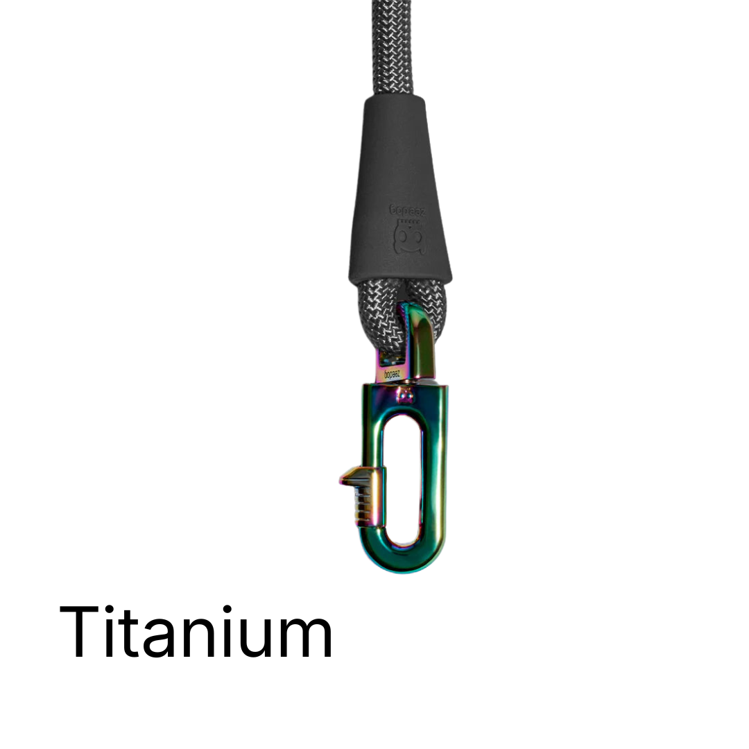 - Titanium: Medium grijze, lichtglanzende lijn met donkergrijze clip en bijpassende siliconen afwerking. Afgewerkt met een neo-chrome musketon in meerkleurige metallic tint. Strak, modern en subtiel opvallend.