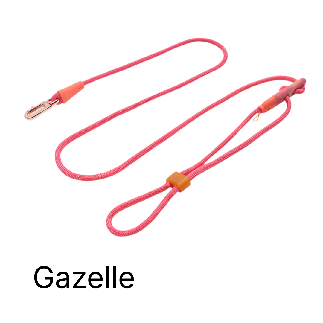 - Gazelle: Glanzend zalmroze lijn met oudroze, subtiel gemêleerde clip en roze schuiver. Afgewerkt met een roségouden musketon en donkeroranje siliconen details. Zacht van kleur, maar met een warme, luxe uitstraling.