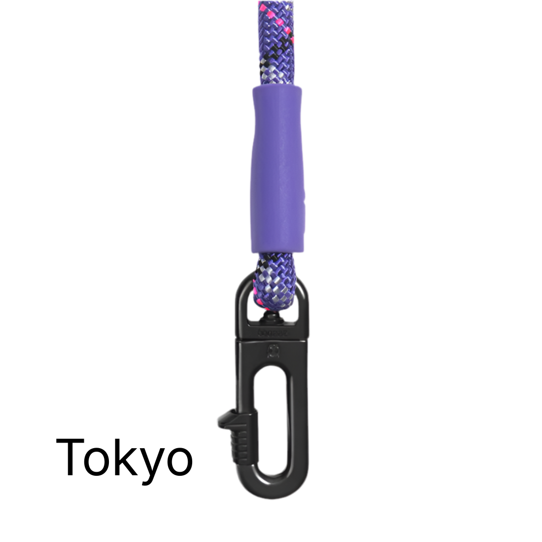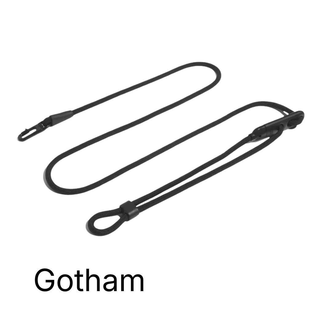 - Gotham : Volledig zwart. Zwarte lijn, zwarte clip, zwarte schuiver en een zwarte musketon met zwarte siliconen afwerking. Strak, minimalistisch en altijd goed.