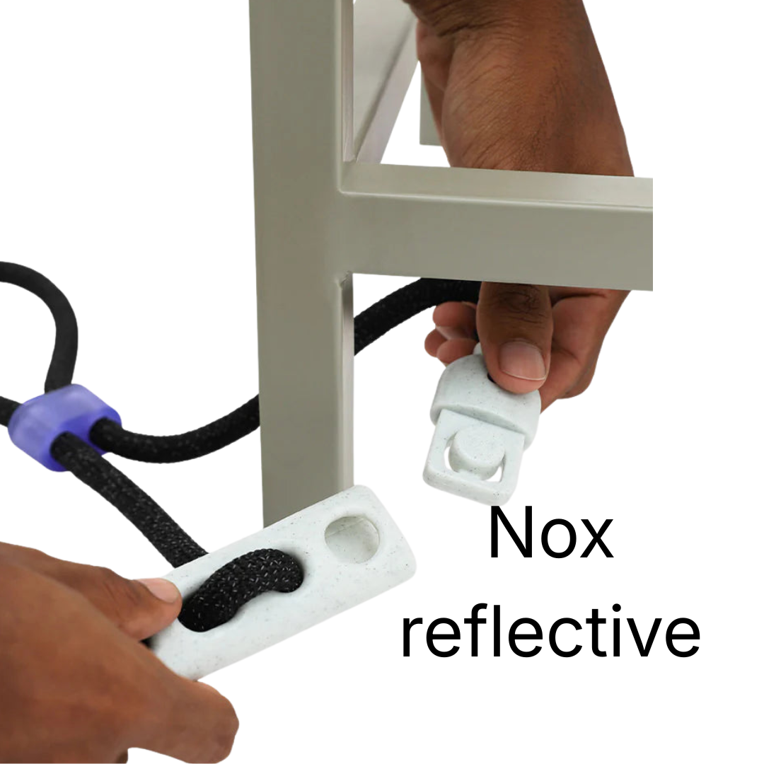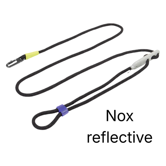 - Nox Reflective: Zwart met ingevlochten reflecterende draden. Met lichtgrijze gespikkelde clip, transparant paarse details en gun black musketon met groene afwerking. Stoer en extra zichtbaar in het donker.